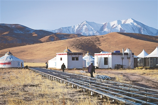 11月10日,工人在青海省海北藏族自治州祁连县仟户牧场的牧旅营地施工。祁连县地处祁连山南麓,草原广袤,牛羊成群。近年来,当地牧业正借助现代科技和产业延链,走上绿色高效的发展之路。