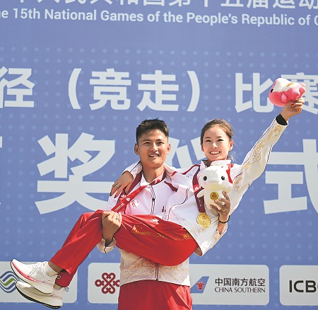 杨家玉(右)与教练、丈夫魏新猛在颁奖仪式上庆祝。新华社记者 张龙 摄