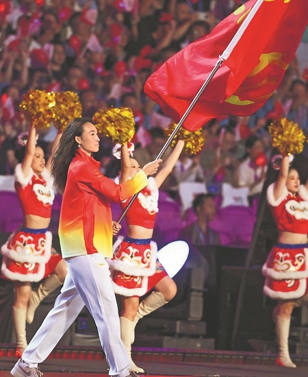 11月9日,湖北省体育代表团旗手郑钦文在入场仪式上。新华社记者 肖艺九 摄