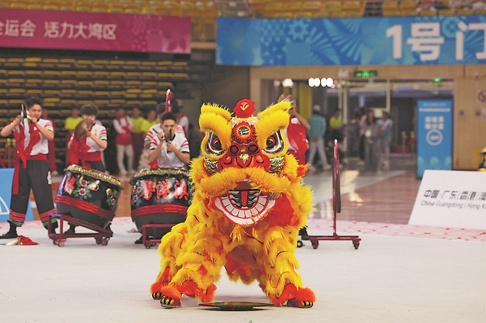 比赛间隙的舞狮表演。本报记者 窦菲涛 摄