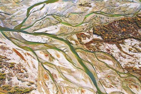11月9日,新疆阿克苏地区。初冬时节,库玛力克河温宿县吐木秀克镇河段,河床如大地的脉络肌理,河水在沙洲间蜿蜒分汊,沿岸植被色彩斑斓,生机别样。