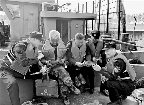 11月16日,山东省枣庄市公安局峄城分局古邵派出所民警辅警走进京杭大运河古邵镇港口,以案说法向船民宣讲安全知识,提醒加强安全防范。