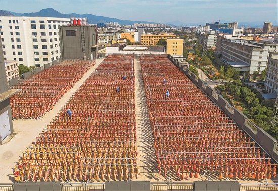 11月19日,浙江省金华金贸火腿有限公司大晒场上,万只火腿齐晒“日光浴”。金华火腿制作技艺2008年列入第二批国家级非物质文化遗产名录。目前,金华市火腿生产企业65家,2024年全产业链年产值23亿元。本报通讯员 时宽兵 摄