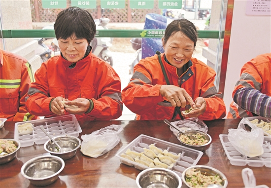 11月18日,环卫工人正在浙江省台州市仙居县城区邮政工会驿站内包饺子。当日,仙居县总工会在城区邮政工会驿站开展冬季“暖心暖胃”志愿服务活动,为环卫工人、快递小哥等户外劳动者送健康体检,并开展包饺子活动。活动还准备了手套、皮护膝、保温杯和冬季常用药品等暖心礼包,让工会驿站成为户外劳动者的温馨港湾。本报通讯员 王华斌 摄
