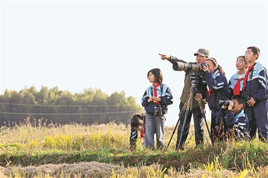 多年来,学校将湿地保护教育融入日常教学,开设自然大课堂,通过“走出去、请进来”的方式,邀请志愿者定期入校进行湿地科普教育,还时常组织学生到湿地观察记录,增强了孩子们对湿地的了解,将保护湿地的种子撒在孩子们的心间。新华社记者 张端 摄