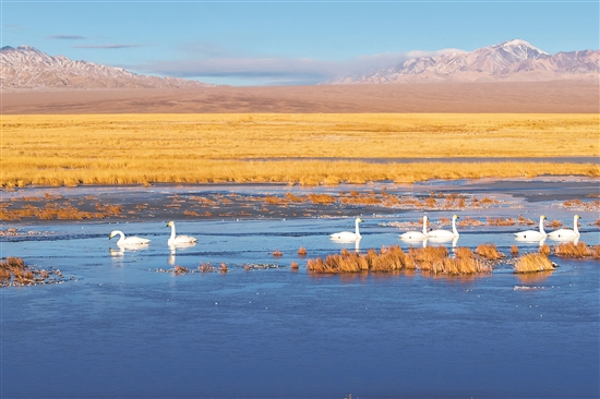 11月14日,在河西走廊西端的甘肃省阿克塞县小苏干湖湿地,大天鹅在一处水域游弋觅食。