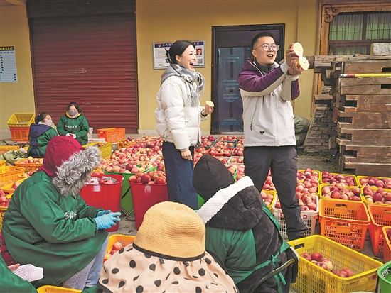 11月20日,在南新镇安乡村,工作人员通过网络直播销售苹果。
