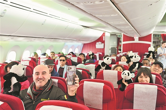 近日,在比利时布鲁塞尔国际机场,搭乘海南航空布鲁塞尔至重庆直飞航线首航航班的乘客在机舱内展示大熊猫玩偶。新华社记者 吕优 摄