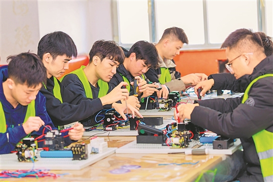 11月24日,新疆乌鲁木齐市天山区西域职业培训学校,学生们正在进行电工作业实操。当日,天山区新华南路街道西河坝前街社区联合该校组织辖区和周边即将毕业的大学生,开展岗位技能培训,为他们的就业保驾护航。
