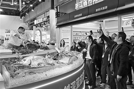 11月21日,2025浙江农业博览会在浙江杭州开幕。本届博览会汇集3500余家企业、4万余种产品,是浙江省规模最大、辐射面最广的农业盛会。图为参观者在浙江省海洋经济发展厅展馆观看金枪鱼切分。