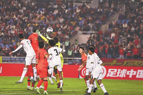 11月24日,在重庆市永川区举行的2026亚足联U17亚洲杯预选赛(A组)小组赛中,中国队14比0战胜东帝汶队,取得两连胜。图为中国队球员张伯霖(上)在比赛中头球破门。新华社记者 黄伟 摄