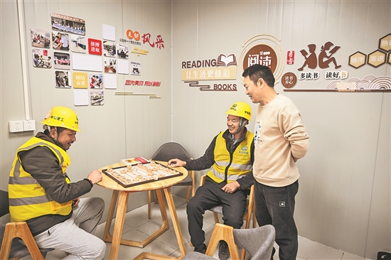 11月25日,工人在江苏苏州北站新时代建筑工人社区工友之家下棋。今年2月,苏州北站综合枢纽工程开工。为更好服务城市建设者,苏州相城区联合建设单位打造建筑工人社区,内部集中设置卫生服务站、警务室、安“薪”驿站、矛盾调解室、法律服务室等公共服务设施,并实行物业统一管理服务。新华社记者 季春鹏 摄