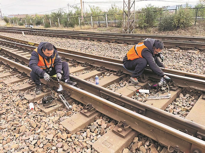 图为工人正在对道岔尖轨、接头焊缝、曲线钢轨等易伤损区段进行人工复核。本报通讯员 张晓皞 摄