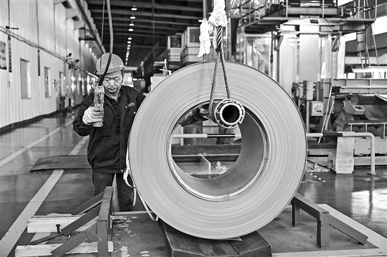 11月25日,在江苏苏州新颖新材料科技股份有限公司,工人吊运冰箱面板半成品。
