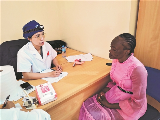 第34批援赤道几内亚中国医疗队近日在赤几首都马拉博一所学校开展义诊活动,为200多名师生进行诊疗并发放药品。图为近日,在赤道几内亚首都马拉博一所学校,中国医疗队妇产科医生为患者诊疗。