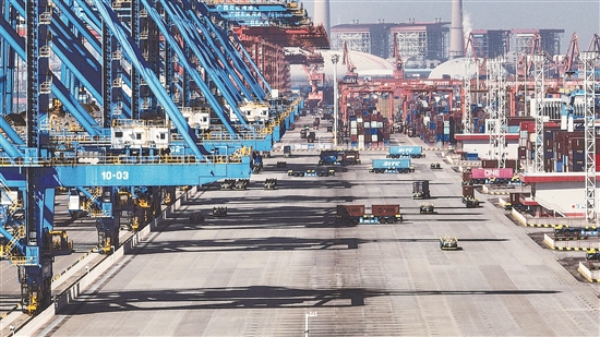 11月29日,在钦州港集装箱自动化码头,智能小车在转运集装箱。
