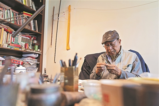 近日,金永才在位于云南省昆明市的乌铜走银传习馆制作乌铜走银工艺品。