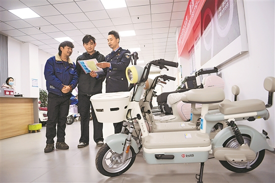 12月1日,湖北省襄阳市交警支队车管所民警在一家电动自行车销售点宣传电动自行车新国标。
