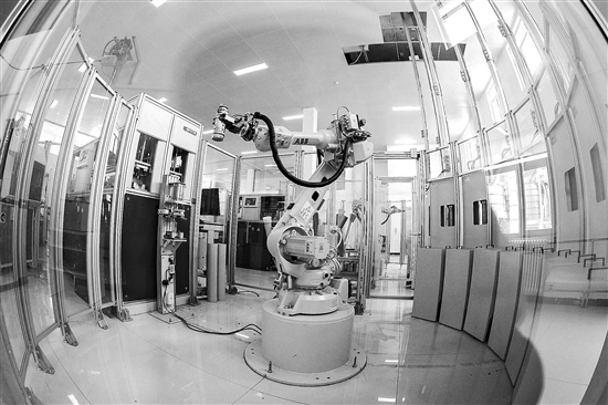 山钢日照公司冶炼分析实验室的六轴机器人正在对炼钢样品进行检验。郭阳 摄