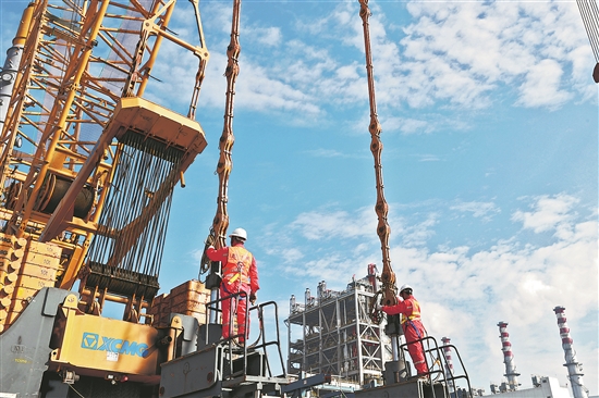 11月24日,在湖南石化生物质气化柔性平台建设项目首台重达95吨的大件设备转化炉吊装现场,班组建设者按规程作业,确保吊装一次成功。彭展 摄