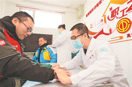 12月3日,新就业形态劳动者在天津市河西区尖山街解放南路商圈职工之家义诊。河西区总工会联合辖区内的尖山街、大营门街、友谊路街、梅江街4个街道总工会,分别依托楼宇党群服务中心、企业活动室等场地资源建立共享职工之家,为职工提供健身、培训、义诊等服务,通过强化各阵地间的协同联动,提升整体服务效能。本报通讯员 沈岳 摄