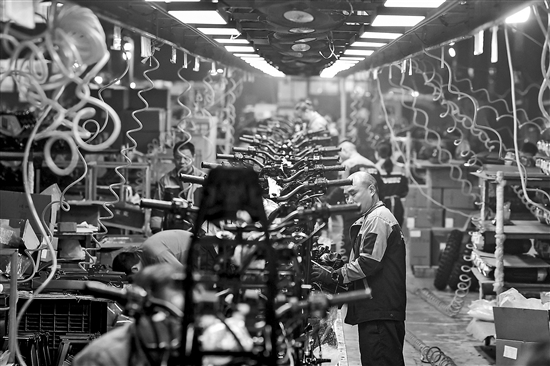 12月2日,在重庆炙焱动力制造有限公司,工人在生产线上组装出口的摩托车。