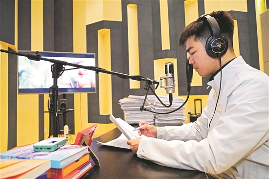 图为“光明影院”志愿者在进行无障碍电影讲述配音(12月1日摄)。