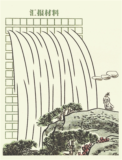 有了这样的心理准备,我们再看漫画家张爱学先生的作品《开“闸”泄洪》,就不至于被充斥于官场职场的“水患”吓倒。您看,就连曾写下“飞流直下三千尺,疑是银河落九天”的诗仙李白,也被这样的景色“惊艳”到了。令李老前辈始料未及的是,如此奇观,竟是从事文字工作的同行制造的。