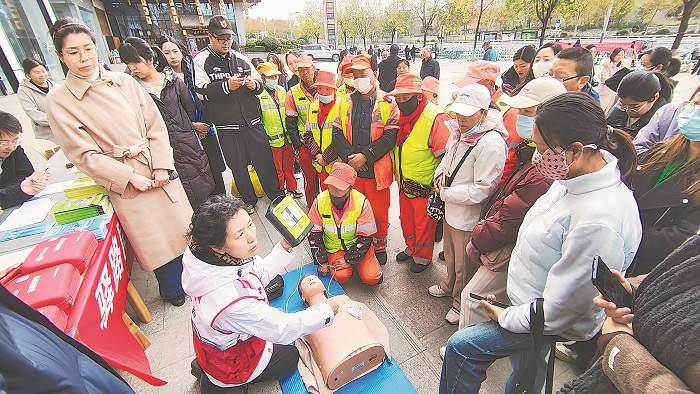 12月2日,在西安长乐西路便民服务大厅工会驿站门前,西安市总工会联合新城区总工会开展“宪法宣传周暨工会驿站普法行”活动。工作人员在普法的同时融入应急救护培训,邀请西安市红十字会专业讲师现场进行实操演示与互动教学,提升大家的自救互救能力。活动吸引了不少新就业形态劳动者、环卫工人围观学习。本报记者 祝盼 毛浓曦 摄