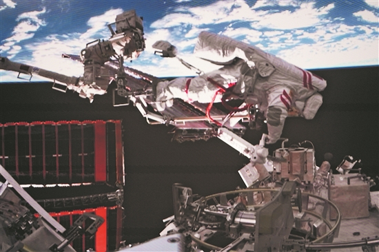 这是12月9日在北京航天飞行控制中心屏幕上拍摄的神舟二十一号乘组航天员张陆在舱外工作的画面。