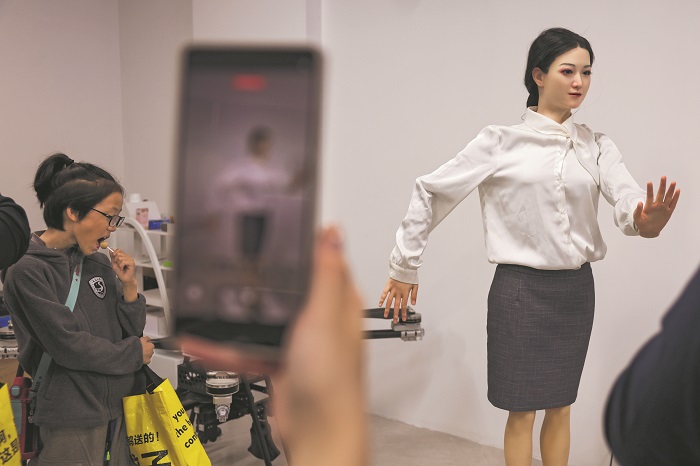12月7日,义乌全球数贸中心内,顾客用手机记录仿真机器人的灵动瞬间。这座新启幕的数字贸易新地标,正以科技互动为依托探索购物新方式。
