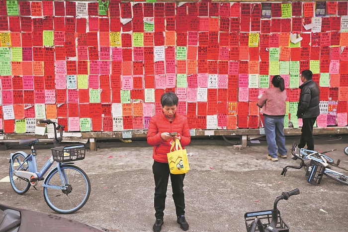 12月9日,义乌五爱库存街的信息栏前,路人在查看张贴的租房信息。这片信息栏是周边寻找商铺、住房的重要信息集散地。