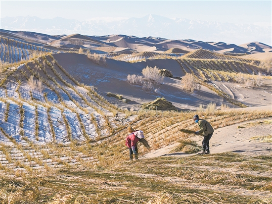 一场冬雪过后,在甘肃省酒泉市阿克塞哈萨克族自治县的库姆塔格沙漠边缘,施工人员忙着铺设沙障,有序推进酒泉市祁连山北麓阿克塞片区水源涵养与生态保护修复项目。该项目总规模22.2万亩,包括工程固沙、封滩(沙)育林、人工造灌木林等防沙治沙项目。