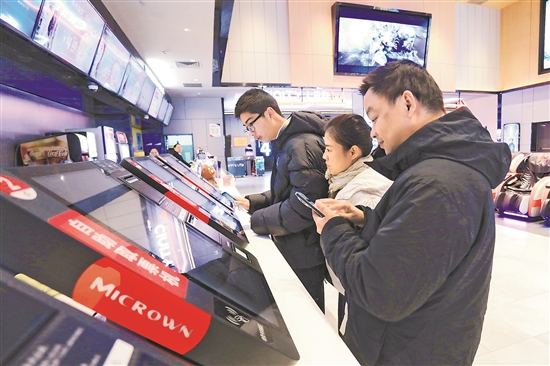 12月14日,在浙江省嘉兴市南湖区一家影城,观众正在取票准备观影。