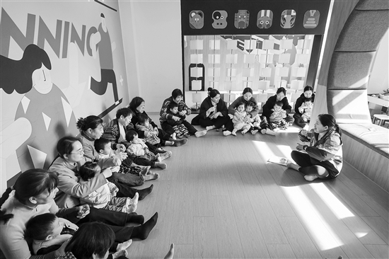 11月27日,在浙江省金华市金东区孝顺镇府东社区的党群服务中心,志愿者给低龄段儿童开展日间托育服务。