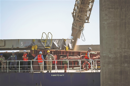 图为近日在阿根廷圣菲省廷布埃斯港,工作人员在一艘装载阿根廷小麦的货轮旁工作。