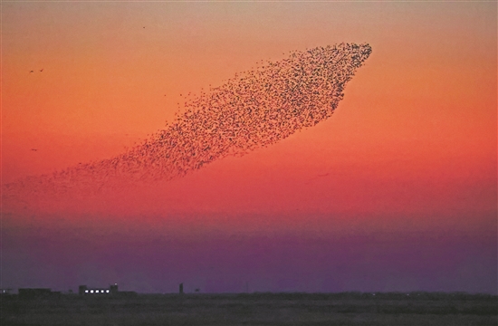 12月8日傍晚,在位于山东省东营市的黄河三角洲国家级自然保护湿地上空,现万鸟化“鲲鹏”的“鸟浪”奇观。进入12月,迁徙而至的候鸟数量达到峰值,黄河口“鸟浪”也迎来了最佳观赏期。周广学/视觉中国