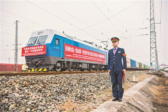 12月15日,中新多式联运示范项目重庆—中亚国际班列在重庆鱼嘴站等待发车。