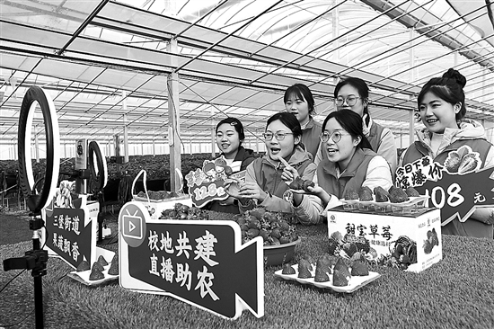 12月17日,江苏建筑职业技术学院经济管理学院电子商务专业的学生在徐州市铜山区三堡街道一农场通过直播销售草莓。
