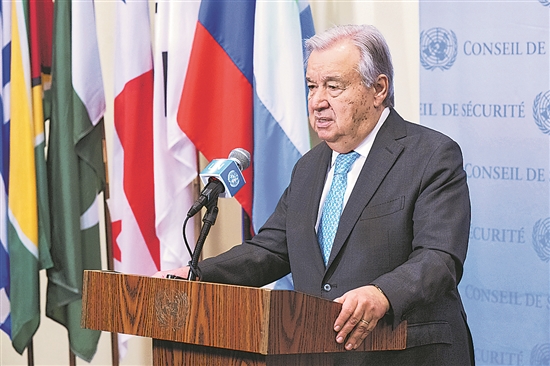 图为近日,在位于纽约的联合国总部,联合国秘书长古特雷斯在记者见面会上讲话。