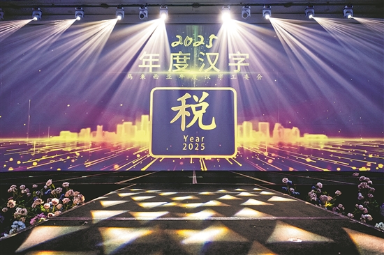 近日,在马来西亚雪兰莪州沙阿兰举行的“2025马来西亚年度汉字”揭晓仪式上,“税”字经公众投票当选。在不确定性加剧的时代背景下,“税”字当选,既是现实压力的集中反映,也体现出公众对事关社会未来的议题的持续关注。图为近日,在马来西亚雪兰莪州沙阿兰举行的“2025马来西亚年度汉字”揭晓仪式上,大屏幕展示年度汉字“税”字。