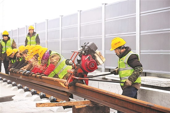 当日,在京港高铁雄商段铺轨施工现场,工人将最后一对500米长钢轨平稳铺设就位,标志着京港高铁雄商段正线铺轨顺利完成,为线路按期开通运营奠定了坚实基础。