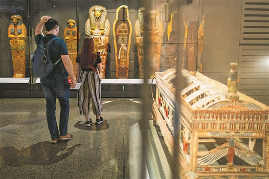 大埃及博物馆是世界上最大的专门展示单一文明(埃及文明)的博物馆,占地约50万平方米,馆藏文物超过10万件。图为近日游客在埃及吉萨的大埃及博物馆内游览。
