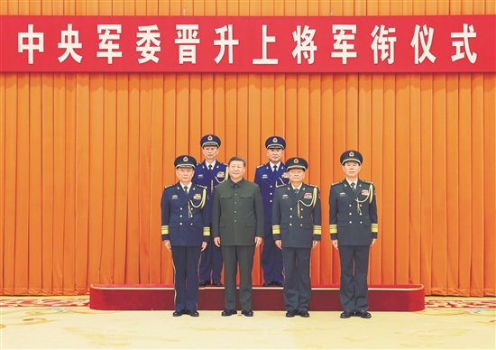 晋衔仪式在嘹亮的中国人民解放军军歌声中结束。随后,习近平等领导同志同晋升上将军衔的军官合影。