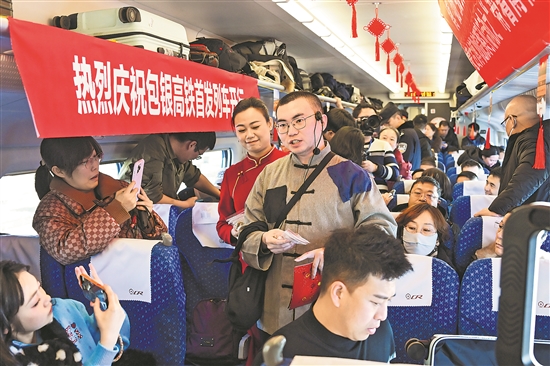 图为12月23日,工作人员(中)在D4667次动车组列车上与旅客互动。新华社记者 李志鹏 摄