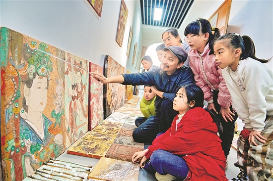 12月20日,参加福建省武夷山市文化馆岩彩画公益课程的孩子们听老师讲解岩彩画作。位于福建北部的武夷山是世界文化与自然双遗产地。其独特的丹霞地貌不仅孕育了独具岩骨花香的武夷岩茶,多彩的岩土也成为绘画的天然颜料库,造就了独具特色的武夷岩彩画。新华社发(陈颖 摄)
