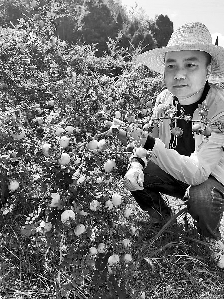安华明在贵州大学内的刺梨苗圃查看刺梨生长情况。受访者供图