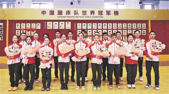 中国蹦床队世界冠军在登榜仪式后合影。新华社发(马子涵 摄)