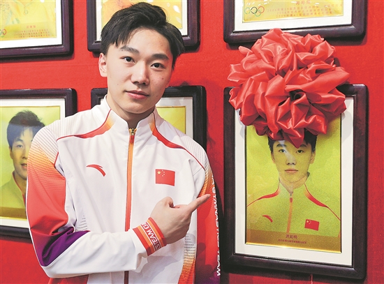 洪延明在登榜仪式后与世界冠军榜上自己的照片合影。新华社发(马子涵 摄)