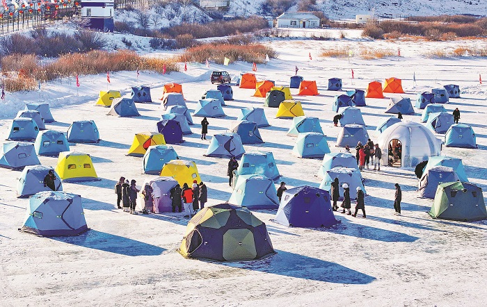 12月23日,游客在内蒙古自治区呼伦贝尔市额尔古纳市黑山头口岸景区冰钓区游览。